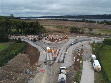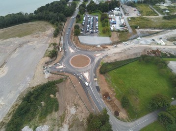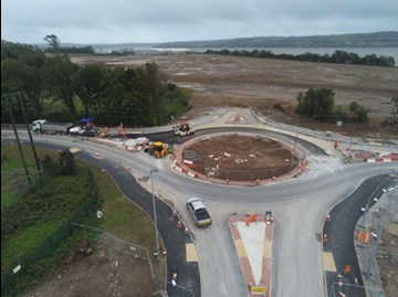 Initially the roundabout works were completed off-line north of the existing road. Traffic was then switched onto this new section of pavement to allow the southern side of the roundabout to be constructed. Maintaining traffic flows was challenging given the limited working room. A combination of traffic lights, supplemented with flagmen at peak times, worked well to keep traffic delays to a minimum during the works.
