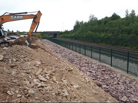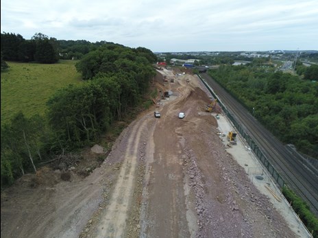 Construction of this portion of the link road includes the construction of an embankment up to 8m in height, along with a ‘Reinforced Earth’ Retaining Wall along the boundary with the live railway line.