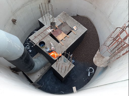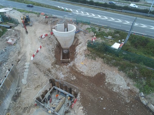 In order to accommodate a proposed structure on the line of the main, along with a change in ground levels a vertical drop of circa 5m was incorporated into the design. Due to location of this vertical drop being in close proximity to the N25 off slip a caisson shaft was constructed as a temporary works solution so as minimise any disruption to traffic. The main was commissioned and taken back into service on the 29th September 2020 in line with the initial programme, allowing for the 7 week site shutdown due to Covid-19.